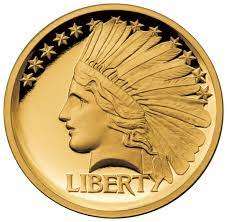 A polished gold Liberty coin, bearing the image of a Native American and five stars.